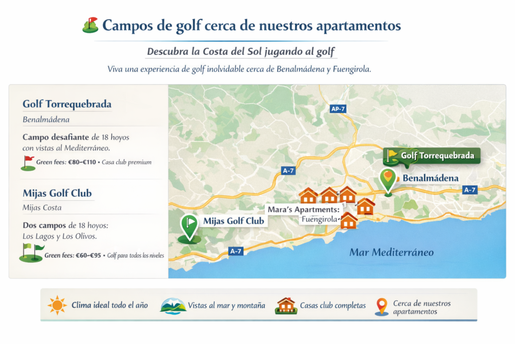 La Costa del Sol, también conocida como la “Costa del Golf”, es uno de los destinos golfísticos más importantes de Europa, con campos espectaculares rodeados de montaña, mar y clima mediterráneo. Desde instalaciones profesionales con servicios completos hasta campos desafiantes para jugadores de todos los niveles, estos dos campos cercanos a nuestros apartamentos son referencias imperdibles para amantes del golf vacacional.