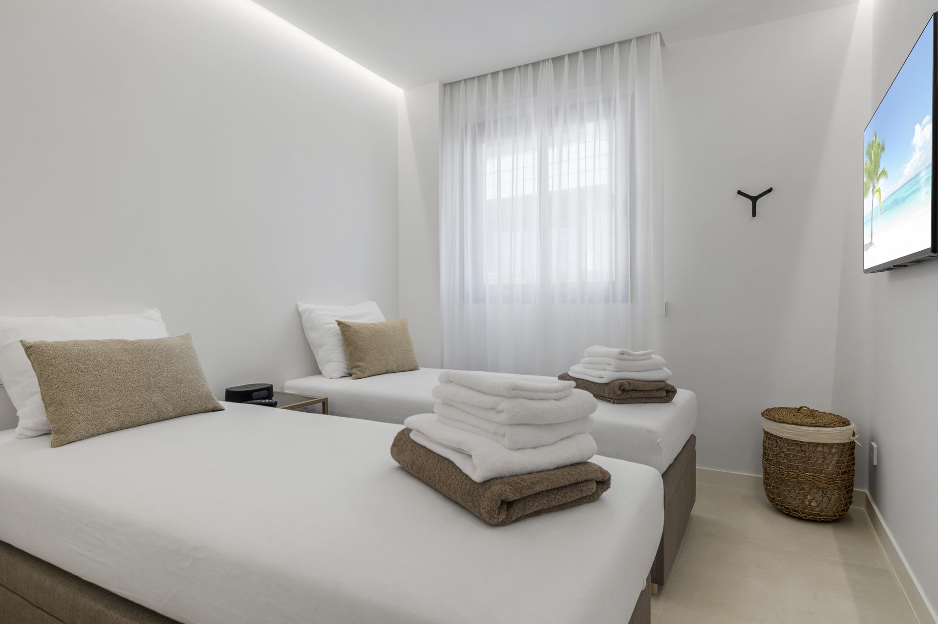 El apartamento cuenta con tres amplios dormitorios, ideal para familias o grupos de hasta seis personas, y dos baños completos con acabados de alta calidad. Los espacios son luminosos, amplios y están cuidadosamente amueblados para ofrecer una experiencia cómoda y relajante durante toda la estancia.